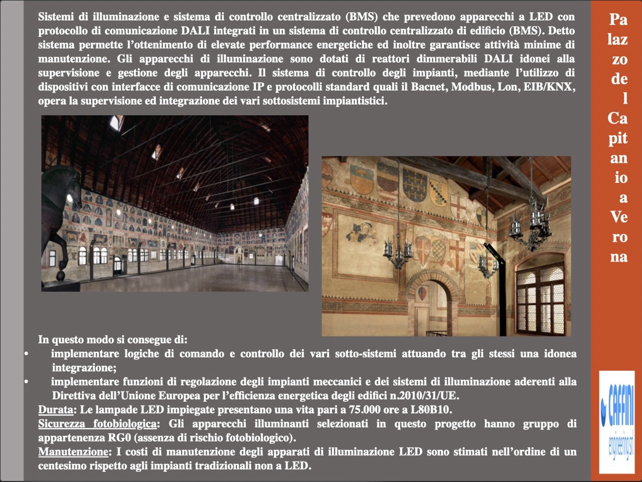 Progettazione, direzione lavori e collaudo degli impianti di riscaldamento invernale, climatizzazione estiva, idrico-sanitario e scarichi, aeraulico di rinnovo dell’aria, impianto idrico antincendio, impianto di spegnimento a gas estinguente per i depositi, controllo acustico, elettrico e speciali, antincendio a servizio dell’intero edificio per il restauro e risanamento conservativo del fabbricato storico “Palazzo del Capitanio” in Piazza dei Signori a Verona