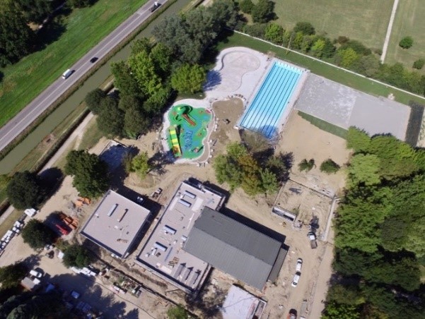 Progettazione preliminare, definitiva, esecutiva, direzione lavori e collaudo di centro sportivo con piscine interne, esterna, spray park, palestra, ristorante, bar, spogliatoi, palestra e solarium a Ferrara Area Ex-Saram per conto del Comune di Ferrara. Il progetto ha previsto il recupero del 92% delle acque utilizzate negli impianti, l’installazione di sistemi fotovoltaici e caldaie di ultima generazione.
