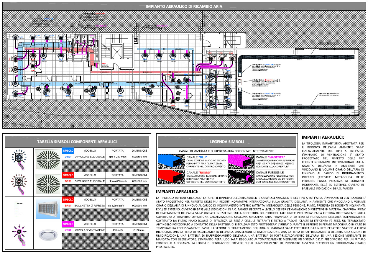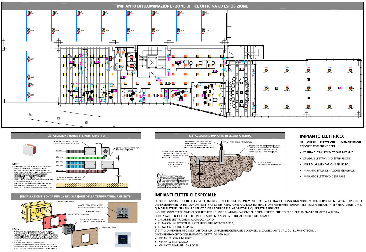 Progettazione preliminare, definitiva ed esecutiva con direzione lavori e collaudi degli impianti termofluidici (riscaldamento invernale, climatizzazione estiva, idrico-sanitario e scarichi, aeraulico di rinnoco dell’aria, ventilazione forzata per le fosse), antincendio ed elettrici (cabina di trasformazione M.T./B.T., quadri di distribuzione, condutture e linee elettriche, illuminazione normale e di emergenza, F.M., asservimento impianti tecnologici, impianti di terra) e speciali (trasmissione dati, predisposizione diffusione sonora, predisposizione Tv analogica e satellitare, predisposizione telecamere a circuito chiuso), coordinamento della sicurezza in fase di progettazione ed esecuzione a servizio dell’insediamento assegnato alle “Officine Brennero S.p.A.” nell’ambito del Comparto Q3 del P.P. del Quadrante Europa presso il Consorzio Z.A.I. in via Sommacampagna, 61 a Verona.